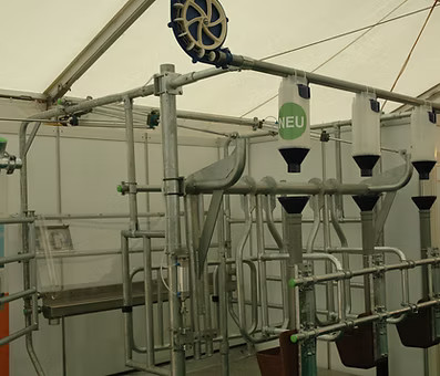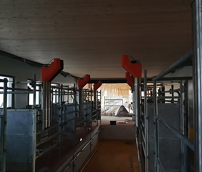 - Die Futterschalen werden beim austreiben der Kühe mit dem Frontgatter hochgeklappt
